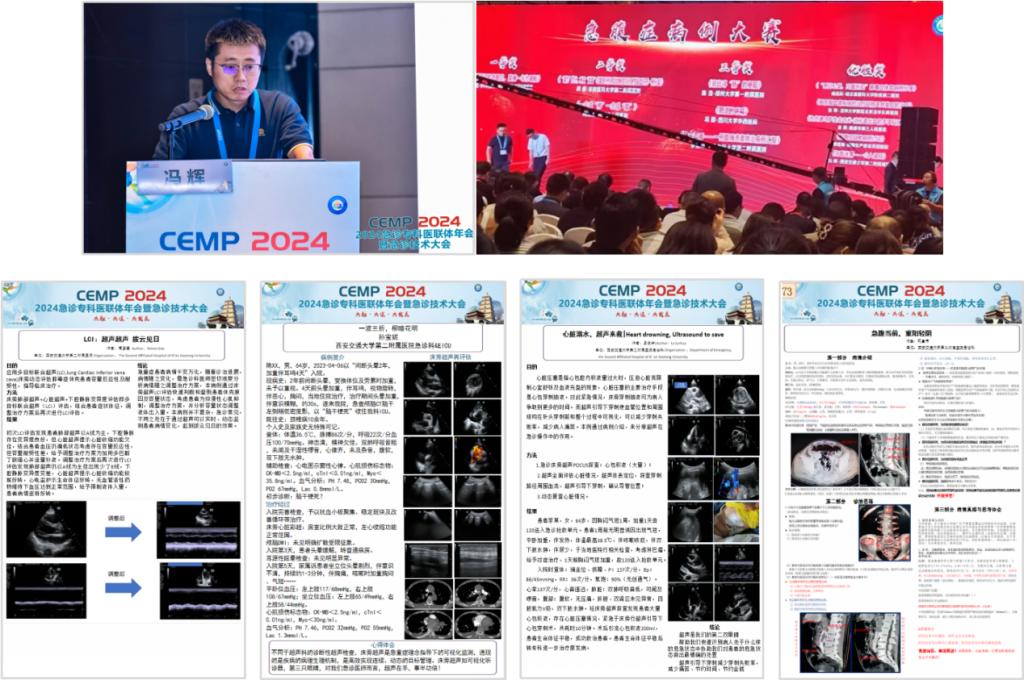 临床思维及竞技场上,交大二附院急诊团队火力全开:冯辉主治医师以《急腹迷雾—介入破晓》为标题做“肠系膜上动脉夹层”病例分享,体现出血管介入技术在急危重症诊断与鉴别诊断中的巨大应用价值。壁报交流环节中,高彦霞主治医师以《超声超视,拨云见日》强调可“应用多目标联合床旁超声实现对脓毒症休克患者容量的精准管理”;孙宝妮主治医师以《一波三折,柳暗花明》展示了床旁超声在急性肺栓塞诊断与鉴别诊断中的重要意义;吕俊华主治医师以《心脏溺水,超声来救》强调“超声引导下心包穿刺”的临床优势;柯昌伟主治医师以《急腹当前,重阳轻阴》,展示了一例Richter疝坎顿坏死、感染性休克患者的艰难诊治过程,凸显出“举一反三,不断论证”的临床诊疗思维。
