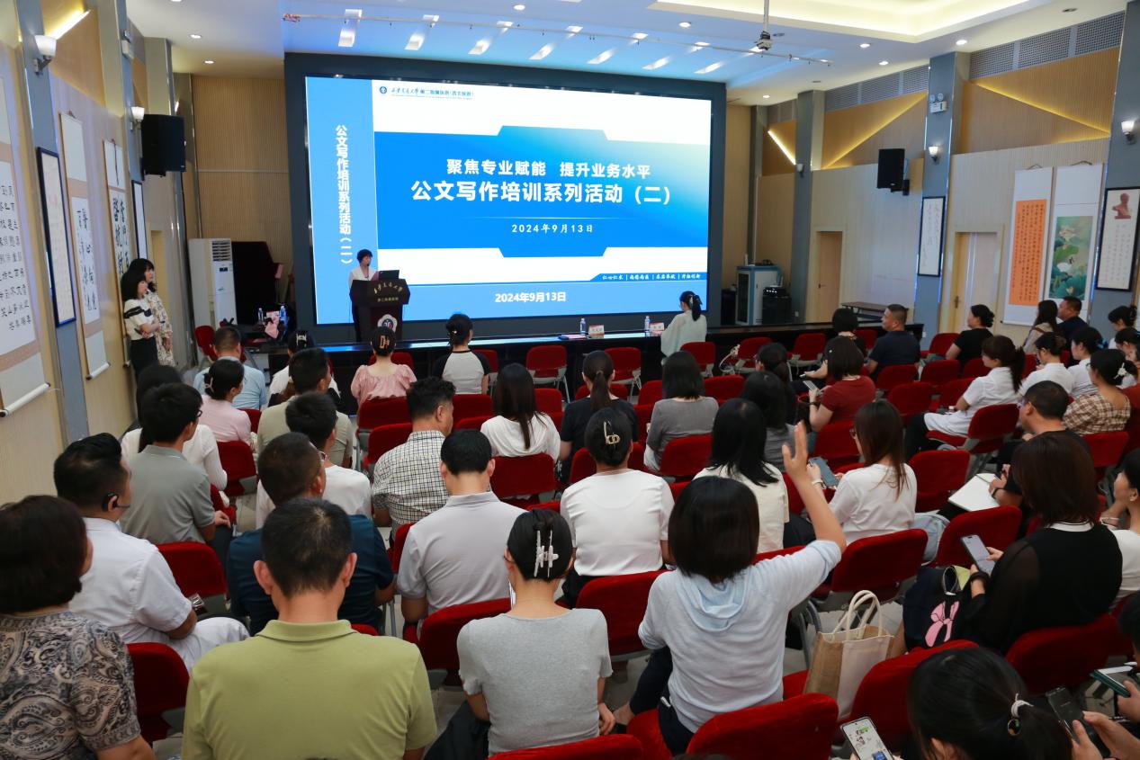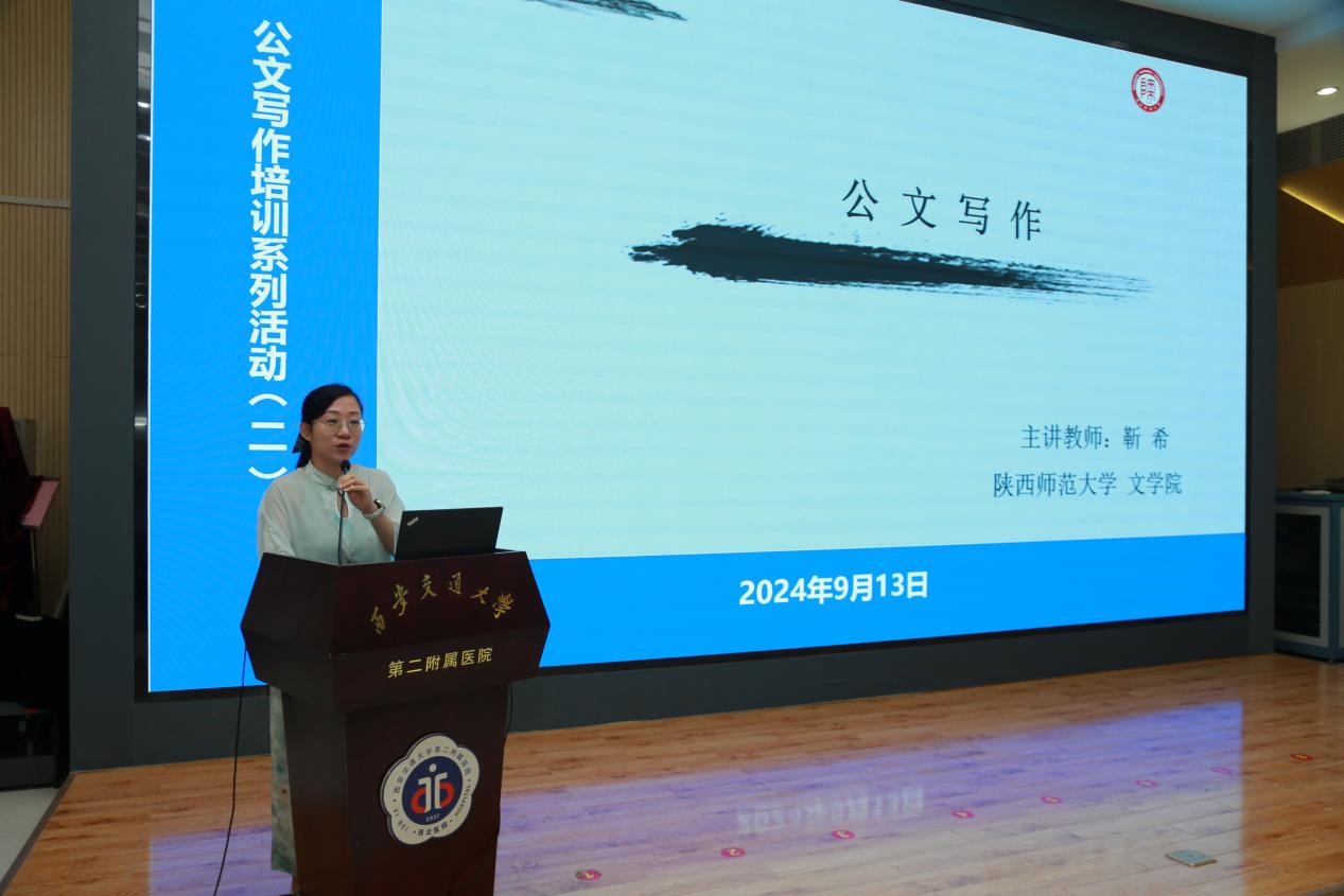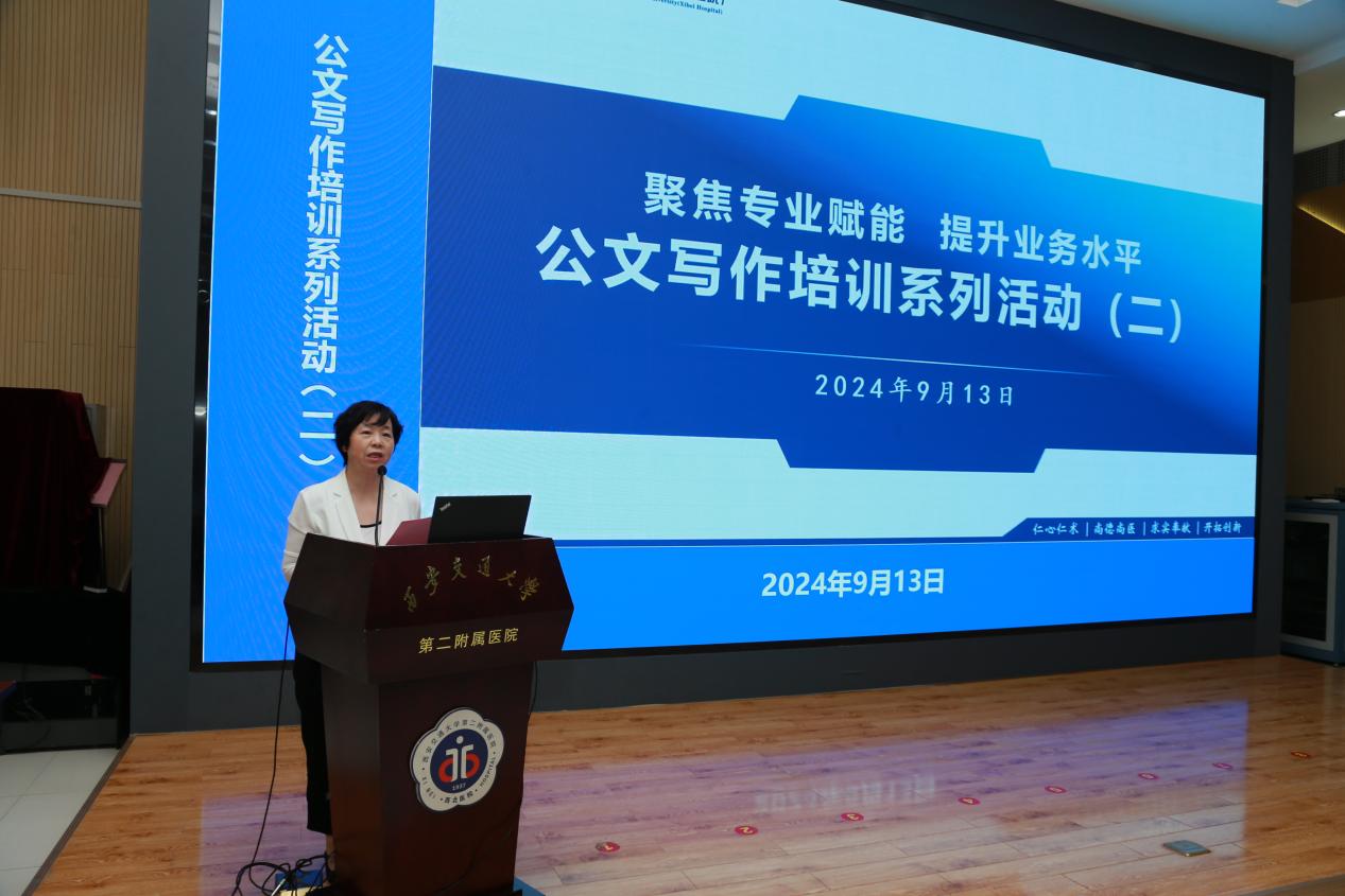 为增强党政后勤部门人员在公文写作领域的专业能力,全面提升管理职能履行的综合素养,推动医院高质量发展,医院举行了“聚焦专业赋能,提升业务水平”公文写作培训系列活动。第二期专题讲座于9月13日下午在南院多功能厅举行,并邀请了陕西师范大学文学院副教授靳希教授作为讲座专家,讲座由党变玲副书记主持。医院党政后勤管理部门全体工作人员、2024年新入职管培生近200人参加了培训。