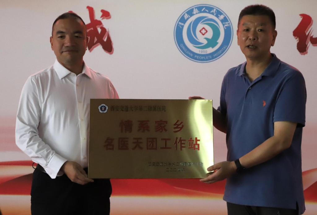 13日早晨,清涧县人民医院与义诊队伍进行了简短的座谈会,院党委委员董新代表医疗队同清涧县卫健局与清涧县人民医院的领导同志洽谈,深入探讨未来的交流合作。董新教授还代表医院工会与清涧县人民医院进行了“情系家乡,名医天团工作站”授牌仪式,并将代表着友谊的青铜器何尊分别赠送给清涧县卫健局与清涧县人民医院。