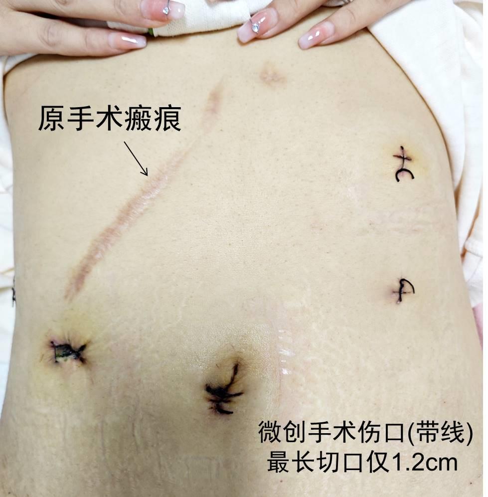 入院后经过详细检查,发现王女士肝门部胆管已接近完全闭塞,梗阻平面已达左右肝管汇合处。此时,王女士已惧怕再次开腹,提出能否尝试腹腔镜手术。要在腹腔镜下完成肝门部炎症狭窄胆管的解剖游离、修整吻合,手术难度极大,对术者的手术技术要求极高。刘昌教授、蒋安教授、曲凯副教授及团队成员的反复论证手术方案,并基于以往的腹腔镜手术经验,决定接受这一挑战。在7月25日在刘昌教授带领下,曲凯副教授、蒋安教授和团队成员为王女士实施全腹腔镜下肝门部胆管成型、高位胆肠吻合术。手术过程中得益于麻醉手术部的默契配合,手术团队成员密切协作,历时5个小时,在腹腔镜下完成肝门部病变胆管切除和左右肝管游离(胆管已明显增厚狭窄,并与周围广泛粘连),将受狭窄影响的左右肝管重新缝合并修整至2cm宽度,最后进行高位肝肠吻合、肠肠吻合以保证胆汁引流。术后患者腹部仅留有几个小切口,最长者1.2cm,短者仅0.5cm。