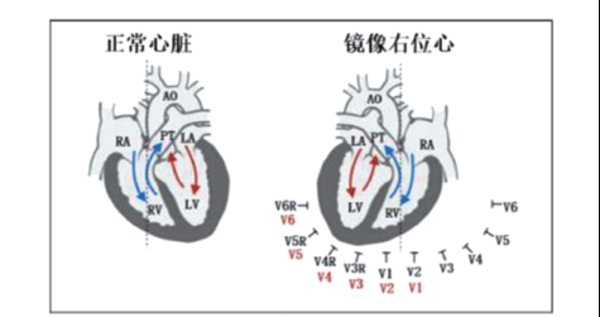 黑字:正常和镜像右位心的心脏解剖结构以及胸前导联的常规位置