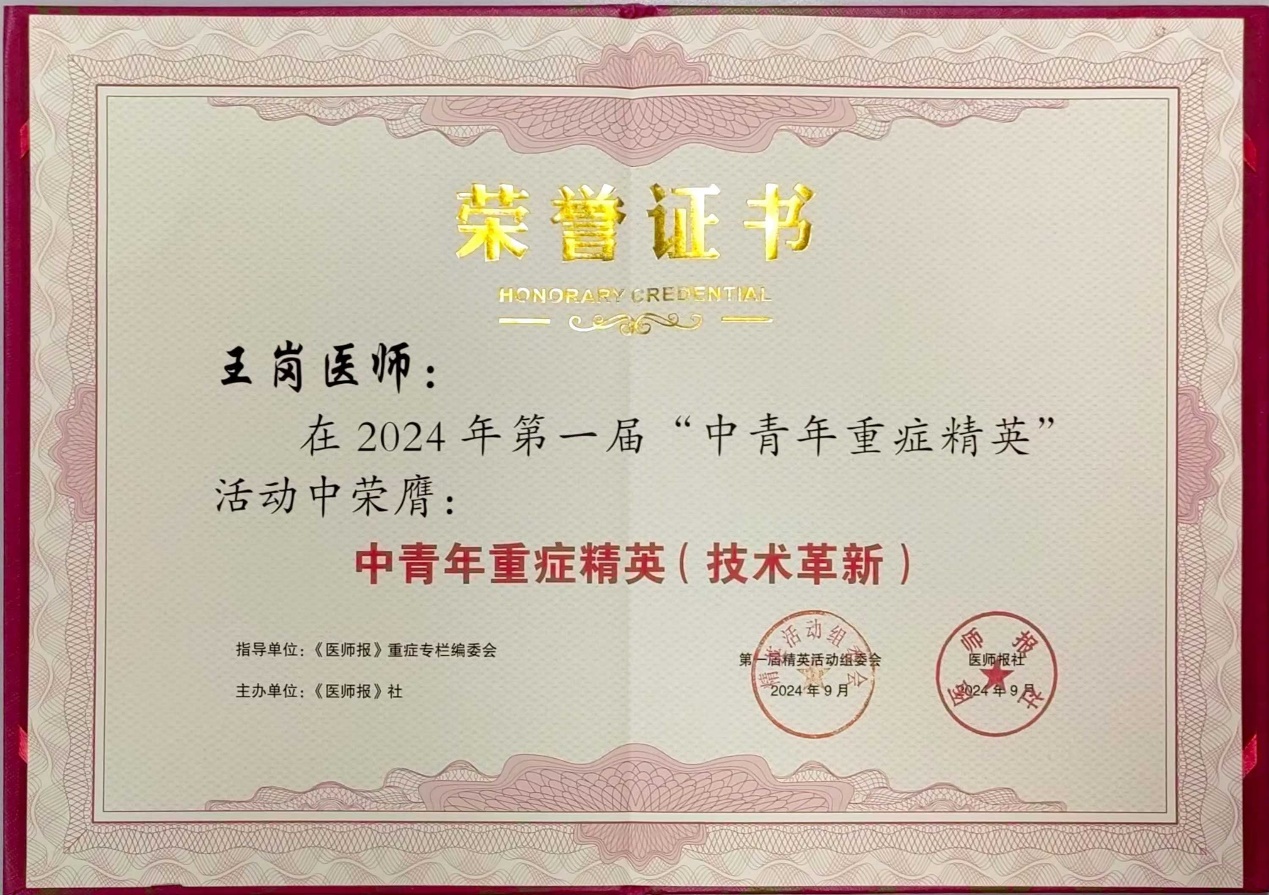 为了鼓励更多的中青年医师投身于重症医学事业,弘扬医务人员正能量,第一届“中青年重症精英”评选活动由《医师报》社主办,在《医师报》重症专栏编委会的指导下圆满落幕。本次评选活动分为科研创新、技术革新、教学创新、管理创新以及医学科普与人文五个类别,全国共有300多名重症医师展开了激烈竞争。我院王岗教授荣获“中青年重症精英(技术革新)”荣誉称号。