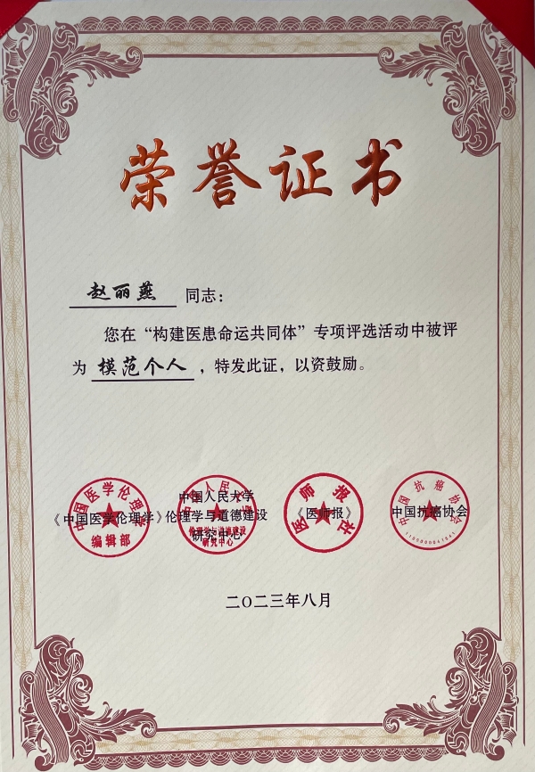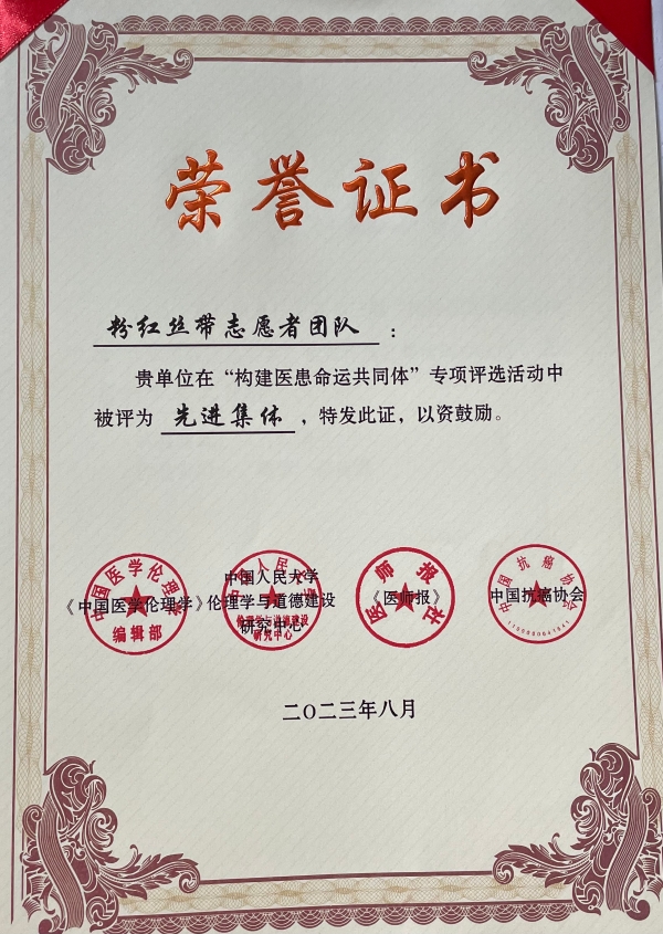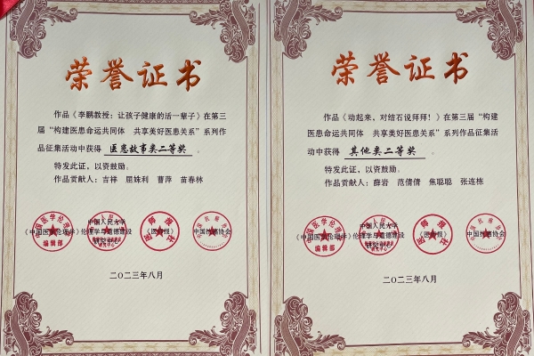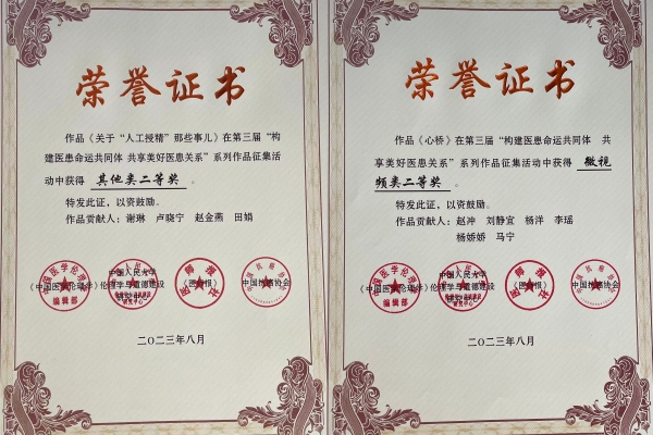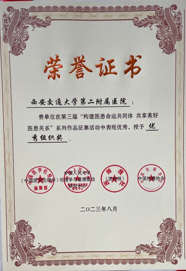 2023年8月2日-4日,第三届“构建医患命运共同体 共享受美好医患关系”学术论坛在哈尔滨举办。由西安交通大学第二附属医院报送的医患故事、微视频等11部作品获奖,医院荣获“优秀组织奖”,肿瘤科和患者共同申报的“粉红丝带志愿者团队”获先进集体奖,医院麻醉手术科赵丽燕护士长获得“模范个人”荣誉称号。