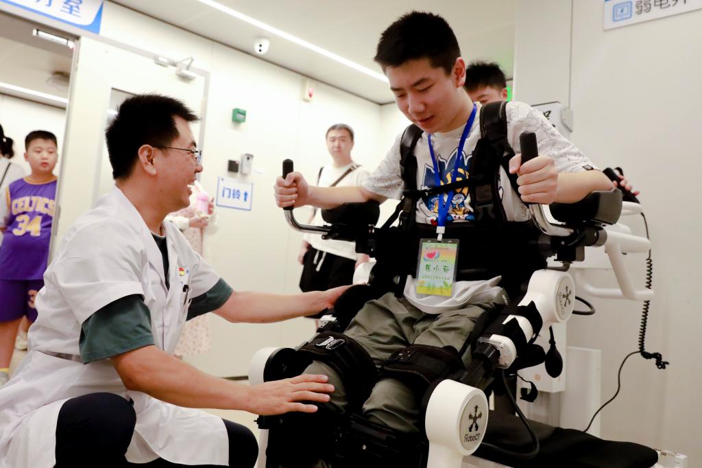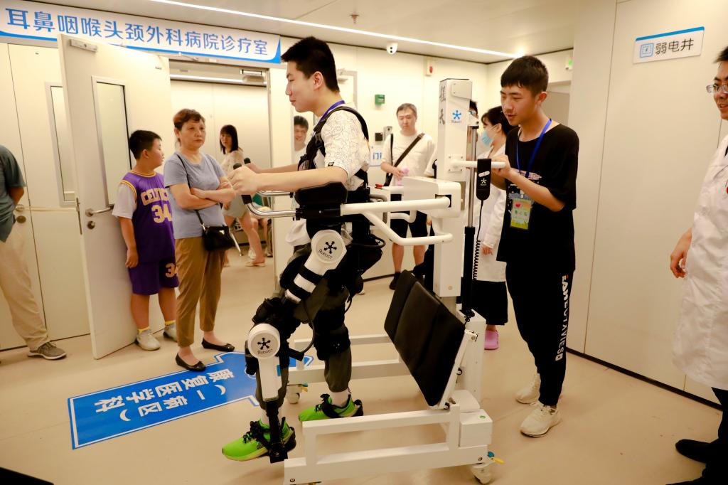 “你看,霹雳变形汽车侠!”在康复医学科功能治疗室门口,孩子们看到新型治疗机器人,把卧床的患者安放在治疗车上,患者的双腿被动行走,步态就像是变形汽车侠,治疗师通过手柄掌握方向,这样通过仪器,患者就能被动行走、锻炼腿部肌肉,防止长期卧床引发的并发症,雷晓辉治疗师还为孩子们讲解眼前多种治疗器械的功能和患者使用后康复效果。