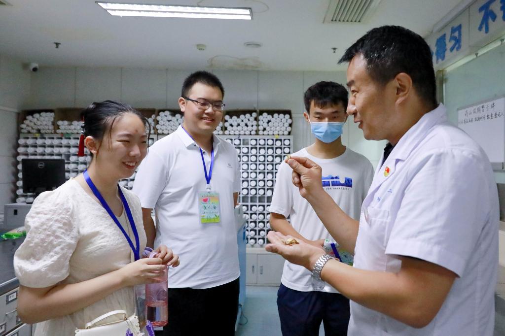 在门诊中草药房,寸伟新主管药师给孩子们介绍了各具特色的中药饮片,讲述了中华先民发现并传承中医药的历史,着重讲解了随着时代的发展,中医药守正创新,努力现代化的产物——智能化中药房。他还热情地回答了孩子们十分有思想的提问,鼓励孩子们认真学习,树立文化自信的同时积极开拓创新。