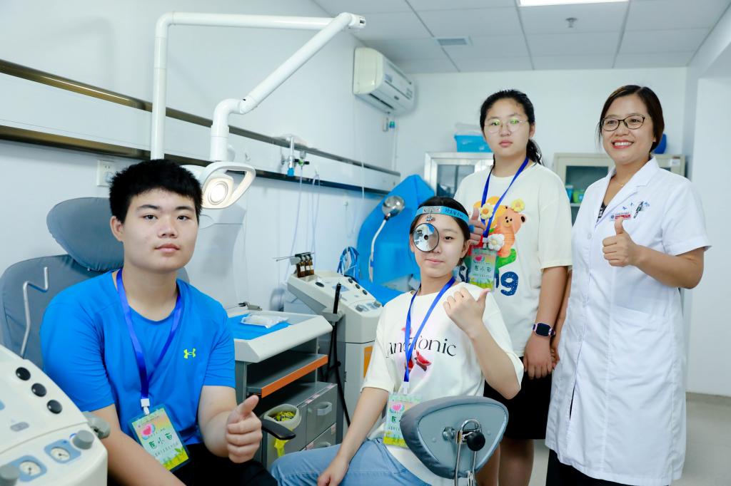 在眼科门诊,何娜护士长带孩子们体验测视力、测眼压、电子验光、眼部雾化熏蒸、以及裂隙灯检查,医务人员给孩子们讲解了眼球解剖、近视防控、干眼预防及治疗,眼科检查仪器的作用及医疗垃圾的分类等,并教会了孩子们七步洗手法。
