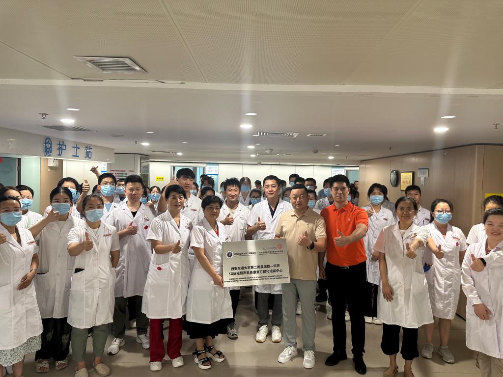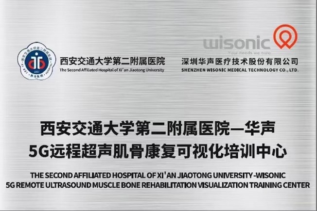 为全面推广可视化超声引导注射技术在康复临床的规范应用,提升我省乃至西北地区康复医师整体技能,西安交通大学第二附属医院康复医学科充分发挥专科特色优势和人才优势,经过前期紧张筹备,7月26日上午,“西安交通大学第二附属医院-华声5G远程超声肌骨康复可视化培训中心”挂牌仪式在西安交通大学第二附属医院康复医学科举行。由西安交通大学第二附属医院康复医学科主任张巧俊教授、乔鸿飞主任医师和设备支持相关人员共同为培训中心揭牌。