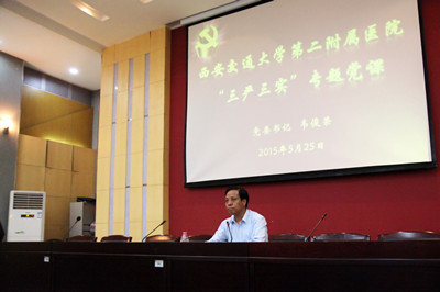 按照中央和学校党委关于“三严三实”专题教育方案的精神和党委书记带头讲党课的工作要求,2015年5月25日下午,我院党委在多功能厅举办“三严三实”专题教育党课,全体院领导、党委委员、纪委委员、各科室正副主任、各总支、支部书记、各病区护士长和各部门工会主席约200人参加专题教育党课会议。党课由院党委书记韦俊荣主讲,党委副书记、纪委书记巩守平主持。