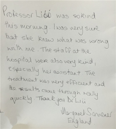 十几分钟后,患者再次返回诊室将一份亲笔书写的感谢信送到刘原教授手里,她说:“此次在西安生病来到交大二院就诊,整个就诊过程让她感受到了亲人般的温暖;这对一名患者,特别是外籍患者来说是一件多么幸运的事情,她从内心赞扬我院工作人员的敬业和友善、感谢刘原教授的热心帮助,谢谢给予她帮助的所有医务人员”。