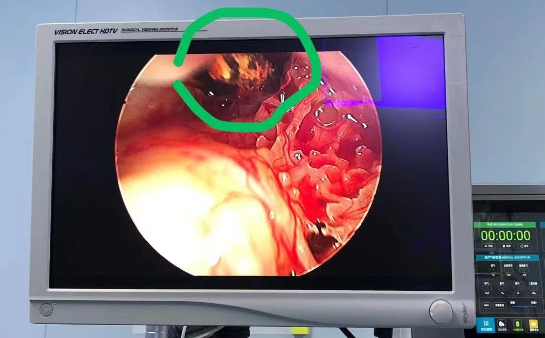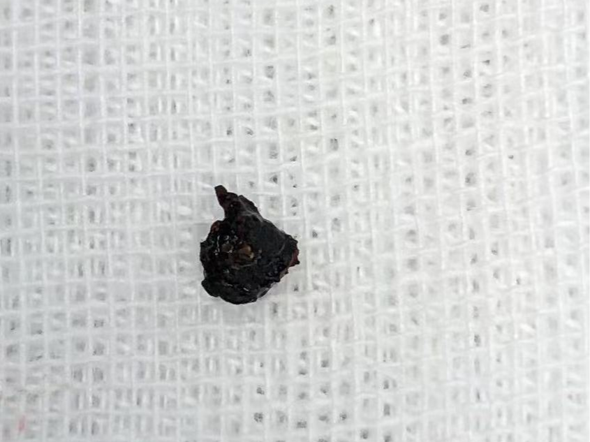 术前张教授带领团队成员认真阅片,分析病情,考虑患者中耳异物是穿透鼓膜进入鼓室腔的,手术必须分离鼓膜彻底暴露前半鼓室腔,由于鼓膜前部外伤后菲薄愈合,分离和取异物过程很有可能造成鼓膜穿孔,需要行鼓膜修补。完善术前准备后,手术于7月18日进行,麻醉科李芳教授、雷晓鸣教授团队麻醉后,张晓彤教授带领胡娟副研究员、高松、石瑶规培医生为患者实施手术,在耳内镜下自鼓环掀开鼓膜后,暴露鼓室腔,在咽鼓管鼓室口可见锈迹斑斑的异物,取出后为金属碎屑,周围鼓室粘膜被铁锈浸润,彻底清理被铁锈浸润的粘膜和鼓膜,鼓膜形成穿孔。遂取大小合适的软骨-软骨膜复合物修复鼓膜,复位外耳道上皮-鼓膜瓣,完成鼓膜修补。术后患者反应轻,已康复出院。