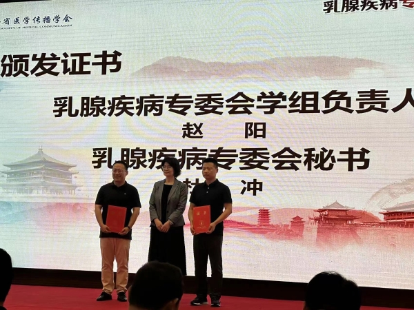 张淑群教授为乳腺疾病专委会学组负责人赵阳副教授和乳腺疾病专委会秘书杜冲颁发证书