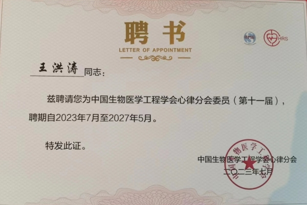 2023年7月21日-23日,由中国生物医学工程学会主办,中国生物医学工程学会心律分会承办的第23届心律学大会(CHRS 2023),在花城广州隆重举行。西安交通大学第二附属医院心血管病院王洪涛教授当选为中国生物医学工程学会心律分会委员。