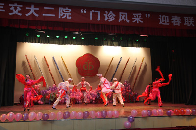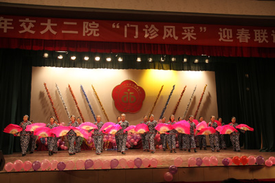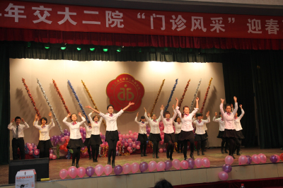 12月26日晚,南院大礼堂张灯结彩、人潮涌动,热闹非凡,2014年交大二院“门诊风采”迎春联谊会演出正在欢快登场。此次联谊会是由门诊部、院工会联合财务部门诊挂号收费处、医保合疗办公室、检验科、药剂科门诊药房、超声研究室、医学影像科、信息网络部及中城卫共10个门诊窗口相关科室举办,以展示门诊工作人员风采为主题,增强门诊工作人员凝聚力、激发爱岗敬业的正能量和工作积极性。