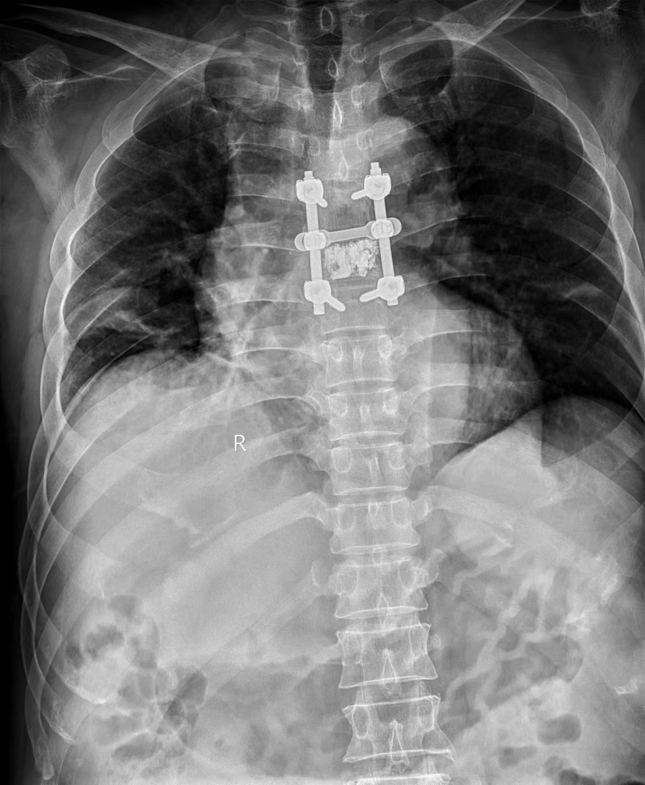 经过充分准备,手术于7月6日如期进行,由薛丽副主任医师麻醉,高宗强副主任医生在董军博士的帮助下,顺利完成了胸5/7椎弓根螺钉置钉、后路减压、胸6椎体灌注骨水泥等工作。在胸6椎体灌注骨水泥时,插入的套筒拔掉针芯后,鲜血就像打开的水龙头一样往外涌。当一切完成后,神经外科周乐主任医生在显微镜下进一步分离硬膜囊周围瘤体组织,见迂曲变形的血管充满了椎管腔,进一步证实了术前瘤体血供异常丰富的判断。在对脊髓进行充分减压并彻底止血后,关闭伤口,完成既定手术方案。术后第二天,患者便诉双下肢麻木症状明显减轻,如今病人下地活动1周多,无明显不适。经放疗科王宝峰教授会诊,待伤口完全愈合1个月后开始术后放疗计划。