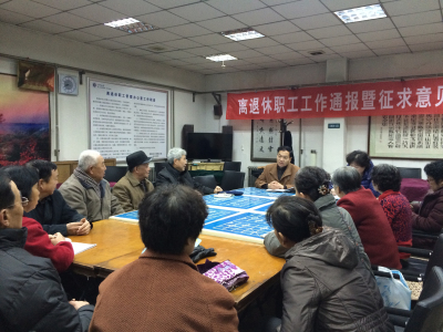 为了落实西交校发(2014)20号文件和西交组(2014)41号关于元旦春节期间开展慰问困难党员、老党员、老干部和老教师等活动的通知精神,按照医院部署,离退休党总支、离退休办于2015年1月9日上午召开会议,讨论确定本次慰问范围。会议由离退休办叶泽宇主任主持,全体支委和办公室人员参加。