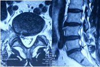 术前可见椎管内脱出的巨大髓核组织压迫神经(箭头所示) 术后3月复查MRI显示脱出的髓核组织消失,神经无明显受压
