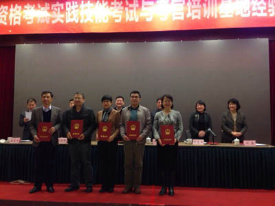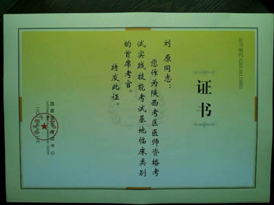 会议最后国家医学考试中心对各省考试基地长期以来在国家医师资格考试工作中做出的努力予以了肯定与感谢,同时向各基地主任、考官颁发了资格证书,我院刘原教授被授予“陕西省医师资格考试实践技能考试基地临床类别首席考官”,成为我省唯一具有该级别资质考官。