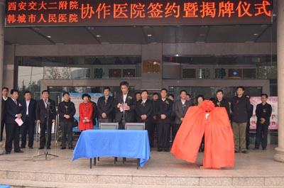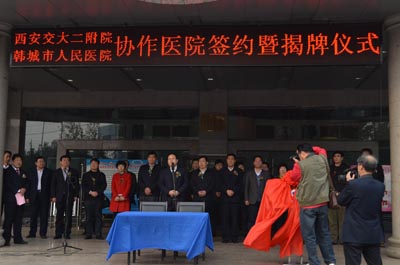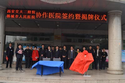 在热烈的气氛中,我院副院长高亚教授、党委副书记黎一鸣教授与韩城市卫生局吴杉局长、韩城市人民医院张胜强院长共同为协作医院揭牌。