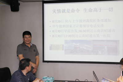 李小鹏主任首先介绍了此次救援工作的基本情况,随后王栋副主任介绍了在云南开展救治工作的具体内容。2014年8月3日16时30分在云南省昭通市鲁甸县发生6.5级地震。8月29日11时,省卫计委紧急通知我院,要求派一名骨科专家赴云南开展震后医疗救援工作。事不宜迟,医务部立即联系骨科,王栋副主任听说后立即主动请缨,要求亲自前往。当日下午,国家卫计委和王栋取得了联系,并安排好相关事宜。30日下午,由王栋率领的陕西医疗队转机到达了云南昭通市第一医院。昭通市第一人民医院始建于1902年,床位1500张,三级乙等医院,本次地震期间,接诊地震住院患者400人次。危重男性患者杨XX,30岁。诊断为地震伤、电击伤、肺炎、肾功能衰竭、脊柱骨折、气管切开术后、双下肢肌肉坏死(70%)清创术后、双下肢切口感染(6处)、双下肢周围神经坏死、深静脉血栓等12项,王栋为该患者进行了三次手术,并多次参与了病情讨论。经过大家坚持不懈地共同努力,一周后,该患者情况逐渐好转,精神状态良好,脱离呼吸机,尿量到达280ml/日,双下肢肿胀明显消退,足背动脉搏动恢复正常,VSD引流量减少,已停止给入肠外营养,主要依靠肠内营养。短短一周时间内,王栋副教授救治危重患者7例,手术人数4人次。他带领的陕西医疗工作队得到当地政府和人民的一致认可和好评,得到国家和省卫计委等各级主管部门的高度赞扬。