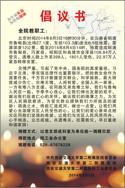 8月3日16时30分,云南省昭通市鲁甸县发生6.5级地震。灾情严重,地震给当地造成了巨大的人员伤亡和财产损失,鲁甸人民的安危牵动着我们交大二院全体教职员工的心。8月5日,我院党委、行政、工会联合发出倡议,号召全院师生员工向灾区人民赈灾捐款。灾难无情,人间有爱,我院党政领导带头,师生员工积极行动,全院迅速掀起了为灾区人民献爱心的活动。