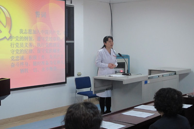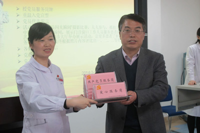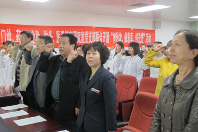会议首先由巩守平副书记为各个支部分别授予党徽以及共产党员服务岗、爱心服务岗的标牌,所有党员,预备党员以及入党积极分子在庄严地党旗下由门诊支部组织委员王咏雪同志带领大家重温入党誓词,各位党员在宣读完誓词后感悟很多,党员代表卢刚同志发言,他深感在2012年门诊党支部组织的设立共产党员服务岗,党员同志统一佩戴胸牌的活动促进了医务工作人员与患者之间的良好沟通,患者对党员工作进行监督的同时也提高了党员同志的服务质量,使得服务窗口实现了窗口的零投诉,为科室群众起到了良好的表率作用。随后院党委办公室党变玲同志以及五位党支部书记依次对此次活动做了发言。检验科支部书记王香玲主任谈了此次活动的心得并对2012年门诊支部开展的设立共产党员服务岗,党员同志统一佩戴胸牌的活动给予了很好地评价;财务科支部书记刘鹏涛主任发言感慨服务在日常工作的重要性,希望各支部间能够相互配合,互相理解争取借此次活动把各项工作做好;药剂科支部书记李兴华老师希望医务人员能够做好自身工作的同时换位思考,站在患者的角度考虑问题,以更好的服务态度改善医患矛盾;党委办公室党变玲主任发言表示此次活动的举办在院党委工作中具有非常重要的意义,非常符合我院以病人为中心的活动理念,为医患沟通创建了一个交流的平台,将新老党员的优秀品质得到了很好地传承,提高了党员同志的服务理念,并表示党委办公室将会大力支持该项活动。