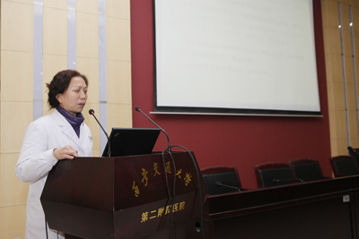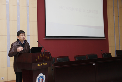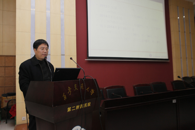 高亚副院长作医疗工作报告,总结我院医疗质量与安全运行情况及医疗工作动态,内容包括2013年临床科室出院诊断排名前五位疾病;陕西省三级医院2013年度运营相关指标情况统计 ;2011-2013年我院病案首页数据分析报告,着重从出院患者情况、住院死亡类、重返类、安全事件类、住院日及住院费用等方面进行深入探讨分析;2013年药品不良反应报告分析。最后强调我院2014年医疗工作要点:强化医疗质量安全管理,构建优质医疗服务品牌。并部署2014年医疗管理工作:进一步完善医疗质量安全体系,保证医疗质量安全;继续加强医疗新技术应用管理,建设关键技术支撑平台;优化医疗服务流程,提高服务满意度;加快信息化管理建设步伐。