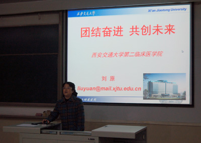刘原副院长回顾了我院的发展历史。我院历来重视学生能力的培养,特别是近年来在教学管理、教师培养、教学竞赛、学生技能竞赛等方面不断创新和突破,取得了优异的成绩。她结合多媒体图片向同学们介绍了医院的现状、规模、人员结构、在医疗和科研方面取得的成果以及对未来发展的规划,增加了学生在二院学习的信心,她亲切的语言、热情洋溢的讲述、师生之间的互动让会场不时传来会心的笑声。