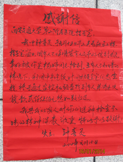 2014年1月15日上午,我院挂号室职工杨婷婷同志在窗口上班时捡拾到遗失在柜台上信封一个。杨婷婷同志立即将信封交给组长殷红梅及张文娇,经查验信封中装有现金2500余元。张文娇、瞿慧组织挂号室人员利用中午休息时间在监控室逐一仔细查找失主,经过认真核查录像,推断出可能是在上午10点时间段就诊的患者钟喜灵,并主动联系到患者钟喜灵。钟喜灵表示的确是自己丢失了现金,但已不报有找回的希望,当他听到我们捡拾到现金时非常高兴和激动,下午专程到挂号室表示感谢并拿出酬金,被挂号室同志拒绝,并表示这些是我们应该做的。
