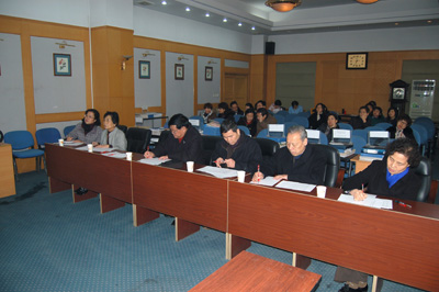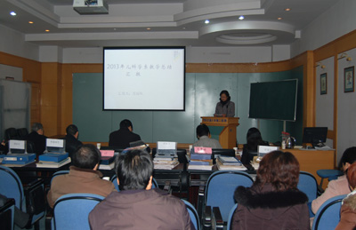 12月18日下午, 教务部组织召开了2013年学科系教学工作总结暨考评会议,其中刘原副院长和资深督导纪宗正教授、任喜民教授、柏春梅教授、吴静教授、许明章副教授担任本次考评会评委,会议由马肖容主任主持,各学科系教学主任、教学秘书、教辅及相关负责人员等40余人参会,本次考评采用学科系教学资料自评、督导复审、教学工作汇报及督导现场评估的形式进行。