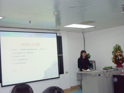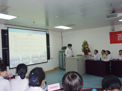 下午3点,比赛正式开始,首先由护联小组组长干三病区护士长李领侠简单介绍了糖尿病护联小组工作开展情况及本次竞赛活动的主要目的,接着护理部刘主任进行了活动致辞,内分泌科护士长李小红及副护士长龙俊宏担任本次竞赛主持。在选手们特色自我介绍及响亮的口号声中,我们迎来竞赛的第一环节:必答题及加分题,必答题共有六轮,每轮必答题之后有一道加分题,必答题由参赛选手作答,加分题由啦啦队完成,啦啦队答对题目可以为自己的代表队加分。每次轮到啦啦队的加分题,大家都在瞬间举起自己的号码牌,主持人几乎无法分辨谁的速度最快,大家积极参与,热情高涨,全场气氛热闹非凡;六轮必答题过后,迎来了紧张刺激的第二个抢答题环节。选手们都精神高度集中,反应敏捷,配合默契,你争我抢;啦啦队也集中精力,关心着各自代表队选手们的成绩。不知不觉中,35道抢答题回答完毕。其中两个代表队竟然出现分数相等的情况,主持人不得不宣布加题赛;本次活动,为了让大家都能够积极参与进来,更好的复习、巩固和强化我们护联小组培训过的相关知识,第三个环节是互动环节,即专门为啦啦队准备了10到抢答题,答对有小礼品相赠。大家准备充分,积极参与,你争我抢,热情高涨。整个过程参赛选手们个个精神饱满,气氛热烈,争先恐后,身手不凡,经过两个多小时的激烈角逐,最终内科队获得冠军,干部中医队和感染整形队获得第二名,外科队及眼耳儿队获得第三名。
