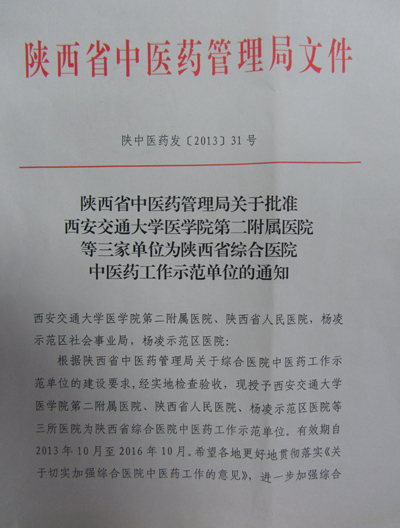 近日,我院收到陕西省中医药管理局关于批准西安交通大学医学院第二附属医院等三家单位为陕西省中医药工作示范单位的通知,根据陕西省中医药管理局关于综合医院中医药工作示范单位的建设要求,经实地检查验收,我院被授予陕西省综合医院工作示范单位。
