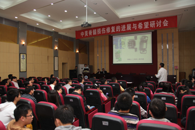 Wise Young教授围绕近年来脊髓损伤的基础进展与临床研究展开讨论,对近期学术热点——细胞移植治疗脊髓损伤做了翔实认真的报告,并根据多年研究经验回答了前来参加讲座师生的相关问题。作为中国脊髓损伤协作组的成员单位,我院在该协作组的协调组织下,目前正在进行“碳酸锂治疗脊髓损伤后神经痛的临床研究”。院长贺西京教授向在场师生和嘉宾介绍了今年来二附院脊髓相关课题的最新进展,西安交大二院在脊髓损伤的研究中紧跟世界先进水平,进行了一系列脊髓损伤的基础与临床研究,取得了一定的临床效果,现又开展了磁共振弥散张量成像(DTI)评估脊髓损伤患者神经纤维束情况的临床检查,充分发挥这一检查手段在脊髓损伤评估中特殊的优势,造福患者、服务科研。