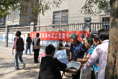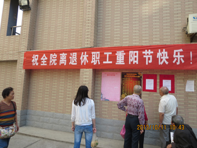 10月10日一大早,离退休党总支、离退休办在南院挂出了欢庆重阳节横幅,营造出节日的喜庆气氛。随后,在医院网页发布并在南北院张贴了慰问信和“2013年寿星榜”,代表医院向老同志们表示节日的祝贺和亲切的慰问。衷心祝愿全院老同志节日快乐,健康长寿。感谢他们过去为医院所做的奉献,同时,也希望老同志继续发扬自强、自立的传统,加强学习、与时俱进,老有所学、老有所为,一如既往的关心和支持医院的建设和发展,为医院的明天建言献策,做出新贡献。