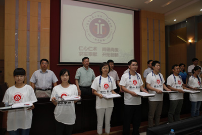 院领导向新职工代表授工作服、胸牌及医疗工作常用物品