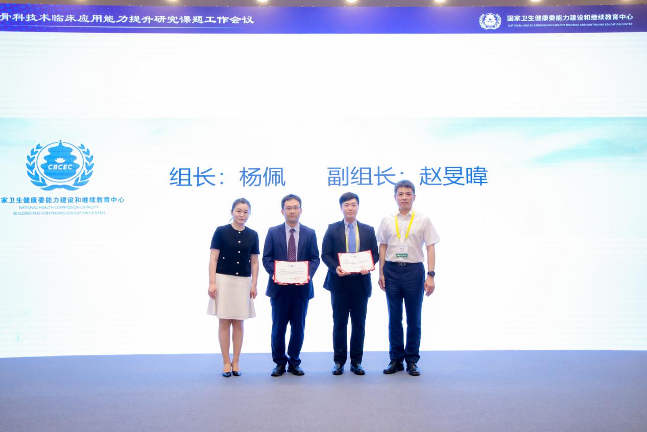 最后,国家卫生健康委能力建设和继续教育中心产业发展办公室负责人郑超颖主任及课题专家组常务副组长、北京大学第三医院田华教授,为课题工作组组长、我院杨佩教授及课题工作组副组长、北京大学第三医院赵旻暐教授颁发聘书。