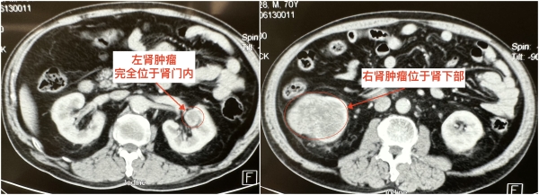 2023年6月15日,患者任某检查发现两侧肾脏均有不明肿块,右侧肿块位于肾下级,大小8cm×7cm×5cm,左侧肿块位于肾门内,大小2.5cm×2cm×2cm,并被肾实质完全覆盖。这对于一位70岁的老人来说犹如晴天霹雳,家里人也十分着急,辗转多家医院均被告知保留肾脏手术难度大,术后可能需要依靠透析生存。后患者经多方打听,了解到西安交大二附院泌尿外科治疗肾癌临床经验丰富,遂经种铁主任门诊收住入院。