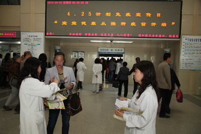 2013年4月25日是第28个全国儿童预防接种日,。上午,预防保健科在门诊楼前举办了4.25“全国儿童预防接种日”宣传活动,并在门诊大厅电子屏滚动播出了今年全国儿童预防接种日的宣传主题:“宝宝健康从接种疫苗开始”。活动现场接受咨询二百余人次,发放宣传单三百余份。