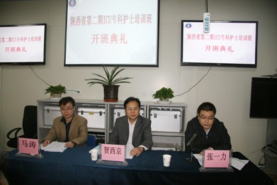 在省卫生厅及我院领导的关注和支持下,为期3个月的陕西省第二期ICU(重症监护病房)专科护士培训班于2013年3月25日在我院开班。陕西省卫生厅医政处张一力副处长、马涛干事,我院院长贺西京,急诊科主任李丽君、重症医学科主任王国恩、心血管内科董新、消化内科鲁晓岚等科室主任、护士长出席了开班典礼,来自全省各个医院的50余名学员参加了开班典礼。典礼由我院护理部主任杨惠云主持。