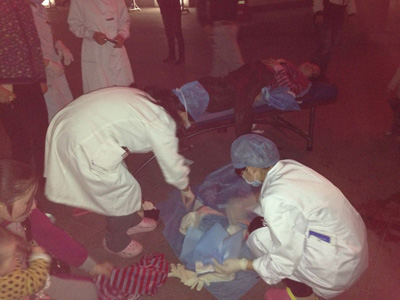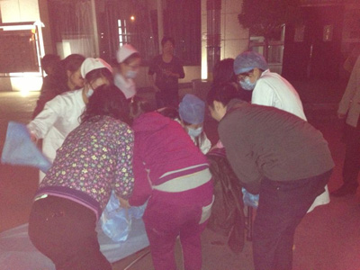 晚上9点多妇产科值班医生樊江波和刘变利正在为一名急诊宫外孕患者进行手术,突然接到电话,门诊大楼前的广场里有一名孕妇急产了,刘变利医生和杨明霞医生立即带着产包和急诊科护士李媛、刘艳利一起赶了过去。到现场后发现,婴儿已娩出,但脐带连着胎盘还未娩出。刘变利医生查看情况后决定就地紧急处理,她先在产妇身下铺好无菌巾,并为产妇断脐和消毒。正在这时,医院刚下夜门诊的儿科主治医师刘海燕途径广场,看到此情况也立即参与救治,她对新生儿进行了初步的检查,并立即联系新生儿病房准备床位,并将新生儿抱往新生儿病区进一步诊治。产妇经过妇产科刘变利等医护人员初步处理后被迅速转送到了妇产科病房。贺西京院长闻知此事后指示:要给少数民族同胞最大的帮助,没有钱,也要收治!期间贺院长多次打电话到妇产科及新生儿科病房,询问母子安危及救治情况,并嘱咐儿科医生注意观察,防止孩子颅内有出血可能。