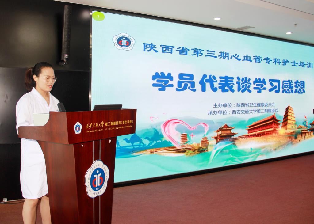 2023年6月30日上午,由西安交通大学第二附属医院承办的陕西省第三期心血管专科护士培训班结业典礼在大明宫院区14楼会议室举行。护理部主任杨惠云,心血管内科党支部书记魏瑾,大明宫院区护士长丁抗宁,心血管内科护士长暨基地负责人王蓉,心血管内科副护士长王妮、宋雅璠、雷蕾、宁珊珊、刘欣源,专科培训班带教老师及心血管专科学员共同参加。培训班班主任宁珊珊主持结业典礼。