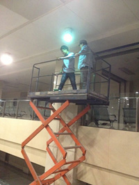2013年3月6日晚7:00至晚10:40,在后勤服务部陈庆杰副主任的督导下,电工班高逢军班长亲自操作,并带领电工班全体工作人员加班对综合门诊大厅高达11米多的顶灯进行维护和更换。
