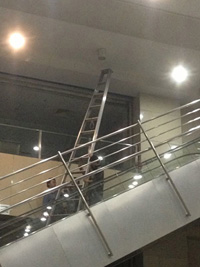 电工班工作人员对特殊方位的顶灯用普通梯进行更换