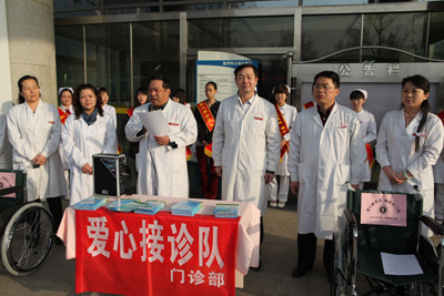 为进一步响应卫生部“三好一满意”活动号召,贯彻落实“管理创先、服务争优”的活动理念,门诊部联合院团委于2013年3月5日“学雷锋日”上午在医院广场举行了“门诊爱心接诊服务”活动启动仪式。仪式邀请高亚副院长、巩守平副书记及相关医技、辅助科室的科室主任参加,由门诊部主任吴世学主持。