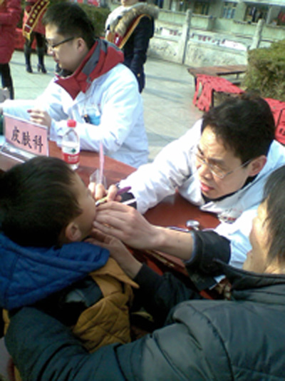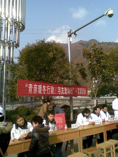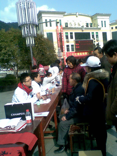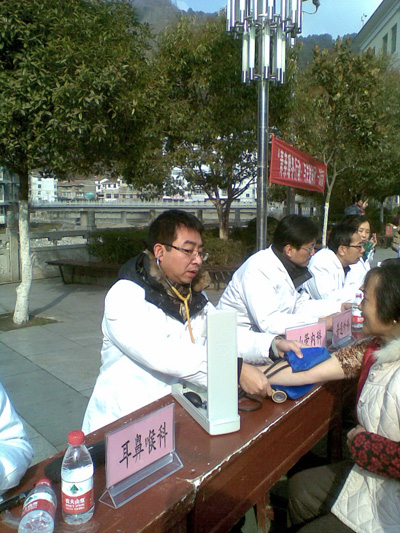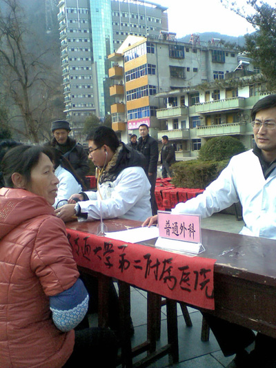 2013年1月22日上午8点,院团委组织小儿内科陈玺副教授、皮肤科张鼎伟主治医师、心血管内科刘昕主治医师、耳鼻喉科盛颖主治医师、普通外科杨屹主治医师等5名专家奔赴位于秦岭山区的安康市宁陕县,参加由团省委组织的“青亲暖冬行动:与关爱同行”——走进秦岭贫困山区献爱心公益活动。