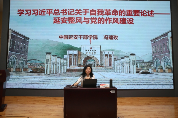 冯建玫教授以《学习习近平总书记关于自我革命的重要论述——延安整风与党的作风建设》为题,结合自身扎实的理论功底和丰富的教学科研成果,从“延安整风的背景及原因”“延安整风的内容、方法与进程”“延安整风的历史贡献”“延安整风的现实启示”四个部分为我们作了一场历史底蕴丰厚、案例生动鲜活、理论指导有力、实践教育深刻、引人深度思考的精彩报告。报告全面解读了延安整风的背景原因,强调延安整风是从指导思想上彻底清除错误路线影响的需要,是保持党的先进性和纯洁性的需要;深刻阐释了延安整风的历史贡献,在推动全党思想大解放基础上使党确立起实事求是的思想方法和思维方式,极大地促进了毛泽东思想作为全党指导思想的确立,为党领导革命提供了强大的思想武器。报告指出坚持用马克思主义及其时代化中国化创新理论武装全党是党的成功之道、胜利之本;拥护“两个确立”,做到“两个维护”是党同心同德、行稳致远的关键所在;勇于自我革命,以整风精神开展批评与自我批评是保证党不变质、不变色、不变味的有力启示。报告内容丰富,讲授生动,氛围浓厚,与会人员聚精会神聆听,纷纷表示受益匪浅。
