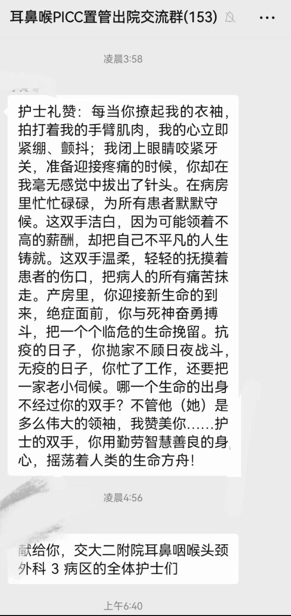 当治疗车推进病房,充满希望的一天开始了,从护理治疗到健康宣教,从功能训练到康复指导……每一件平凡的小事,对患者来说都是莫大的安慰,他将感激之情化作文字,书写出对王敏护士的感谢,沉淀在耳鼻喉科所有护士的心里。在凌晨3:58的夜里,他写到: