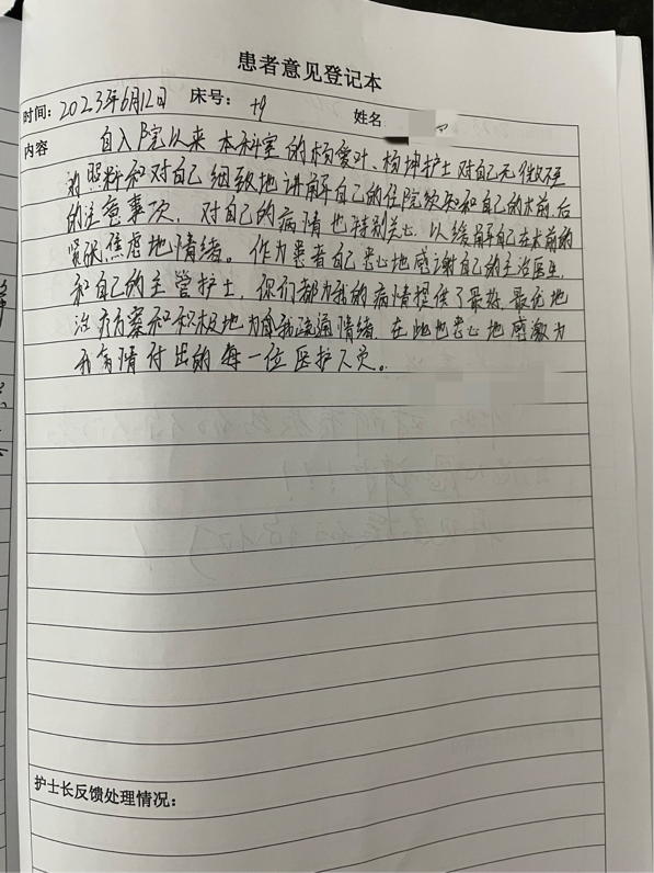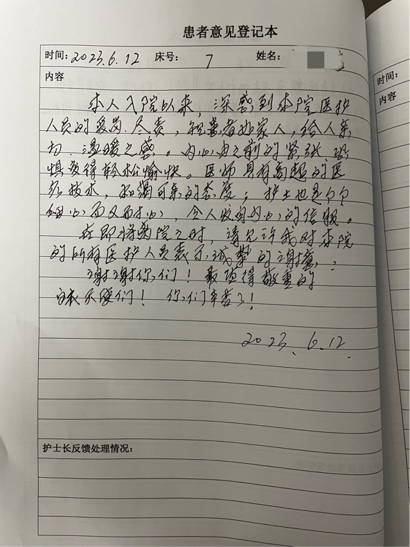 每一句感谢的背后是一个个真情故事的缩影,承载了一段亲如家人、温暖和谐的护患情,在无数个娓娓道来的故事中,我们可以看到患者与医护之间的动人瞬间,这只是所有故事中的其中一角。患者的感谢,不仅是对两位护士优质服务的见证,也是对耳鼻喉科护理工作的认可;医护们收获的不仅是一份荣誉,更是一份期望、一份鞭策、一份信任。