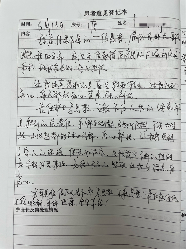 一滴水折射光辉,一封信饱含深情。作为医务工作者,最大的收获莫过于患者的康复及对于我们工作的肯定和信任。这份炙热的情感和深深的信赖,弥足珍贵。感谢信虽小,可印初心,耳鼻咽喉头颈外科病院医护人员齐心合力,持续加强服务内涵建设,从患者需求出发,将“人文关怀”理念深入到为患者诊断、治疗、护理的点滴细节中,充分发挥专科优势,为患者和广大居民提供全面、全程、专业、人性化的服务。