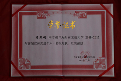 12月27日,西安交大2011—2012年新闻宣传工作表彰会在交大科学馆举行。我院荣获“2011—2012年新闻宣传优秀单位”,宣传部屈姝利被评为“2011—2012年新闻宣传先进个人”。