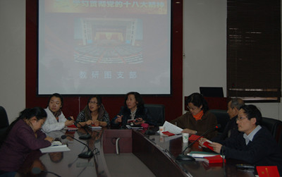 ?12月12日,教研图支部召开系列专题会议,继续以学习《坚定不移沿着中国特色社会主义道路前进 为全面建成小康社会而奋斗》十八大报告文件和《中国共产党章程》(修正案)为主线,对十八大报告及党章修正案作深入解读和探讨。